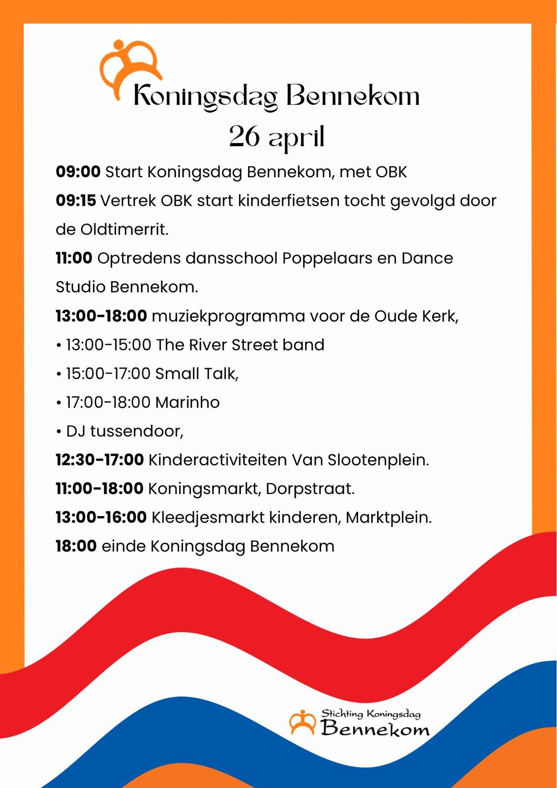 Bennekom kleurt weer oranje! Op 26 april vieren we samen Koningsdag met een gezellig en gevarieerd programma voor jong en oud. Van muziek en optredens tot kinderactiviteiten, een vrijmarkt en een oldtimerrit – het hele dorp bruist de hele dag.